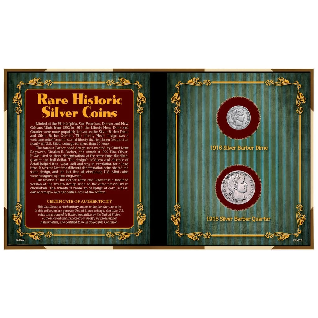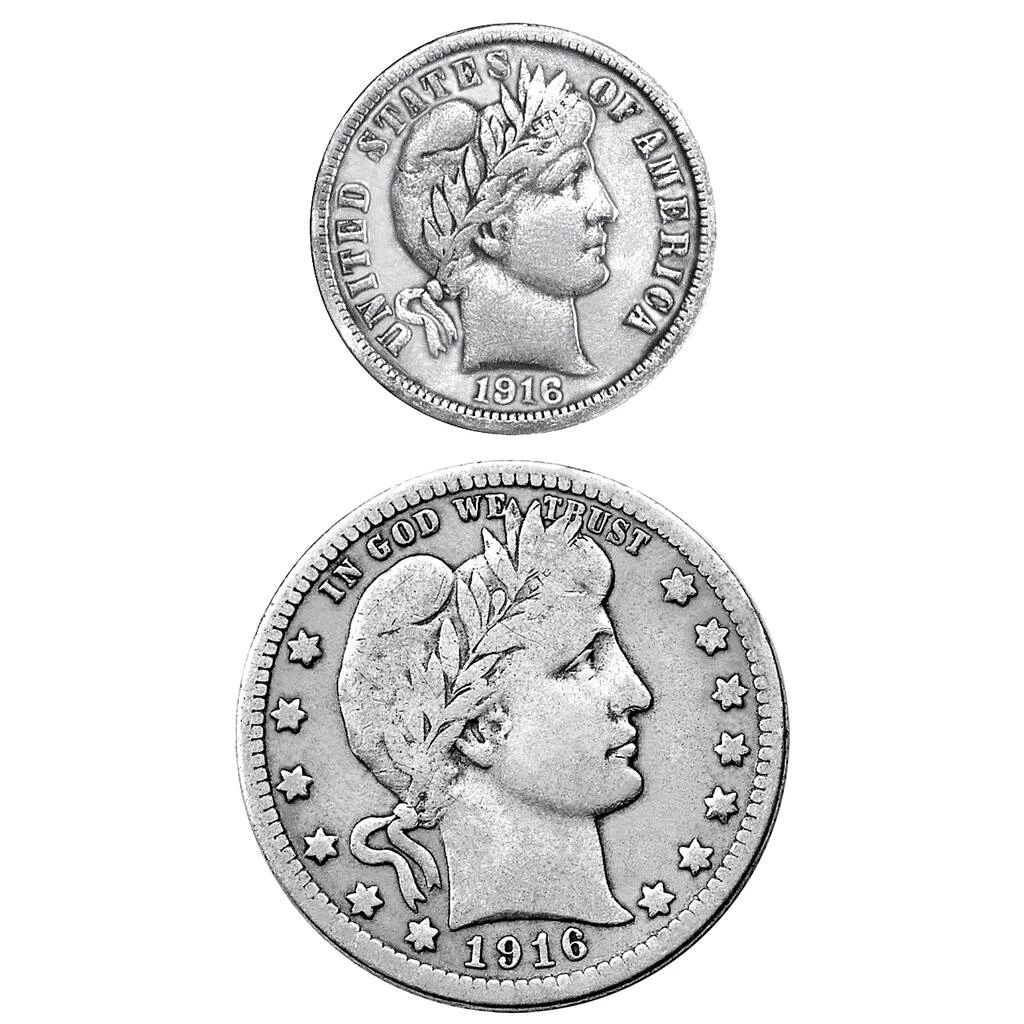 The Last Year of Issue Barber Dime and Barber Quarter minted in 1916 make this Silver Coin set a rare collectible. The Silver Barber Dime and Silver Barber Quarter were minted from 1892 to 1916. These .900 fine silver coins also known as the Liberty Head dime and quarter were designed by Charles E. Barber. Both coins feature the profile of Liberty on the obverse. It was the last time that different denominations shared the same design and all circulating mint coins were designed by the mint engravers.