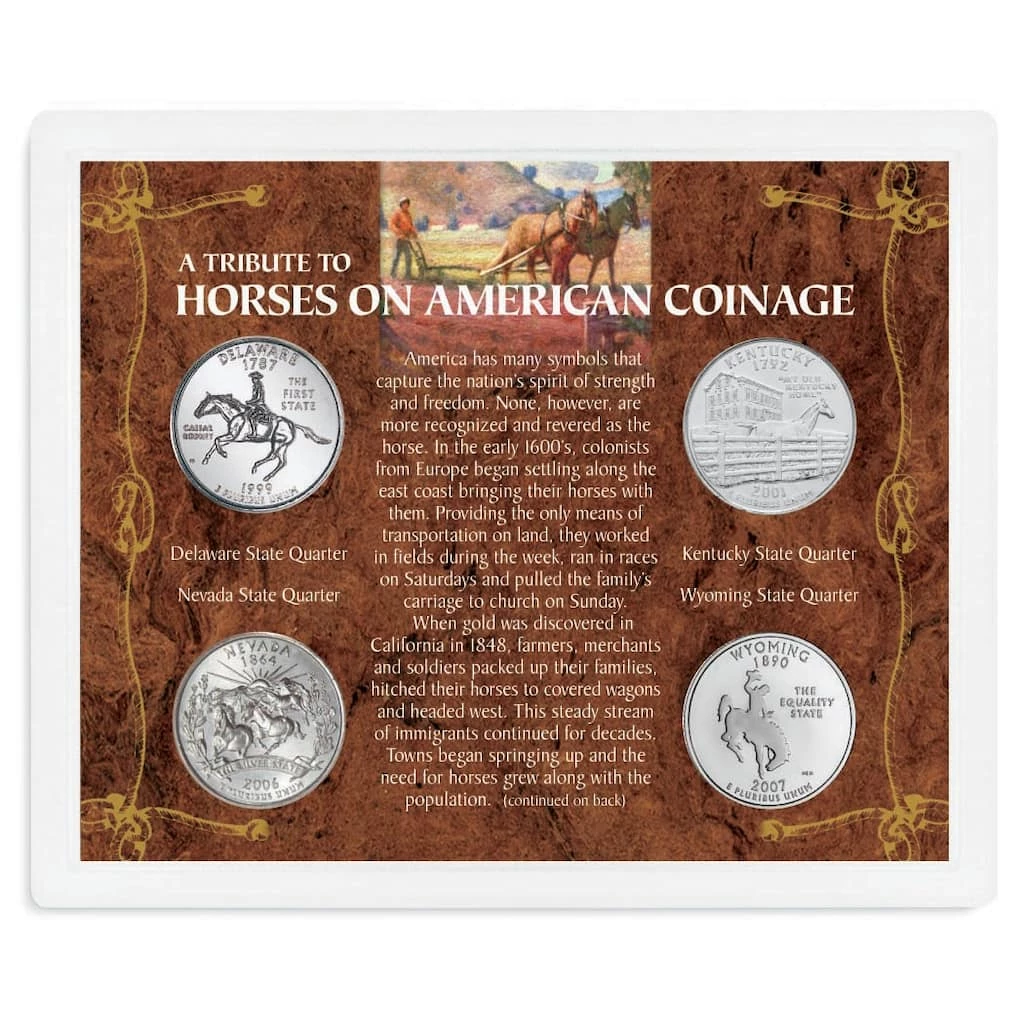 A historical tribute to the horse is captured in an acrylic case enhanced with four genuine US statehood quarters. The four quarters each display the reverse side showing the horse. The Delaware State Quarter depicts the ride to Independence with Caesar Rodney galloping to Philadelphia. Thanks to Rodney and the horses he rode he was the deciding vote for in favor of our nation’s Independence. The Kentucky state quarter depicts a thoroughbred racehorse next to a fence in front of Federal Hill. The Nevada state quarter displays a trio of wild mustangs. Nevada is home to over 50 percent of the United States’ population of wild horses. The Wyoming state quarter features a bucking horse and rider. The four coin tribute is a great gift for the horse lover or coin collector.