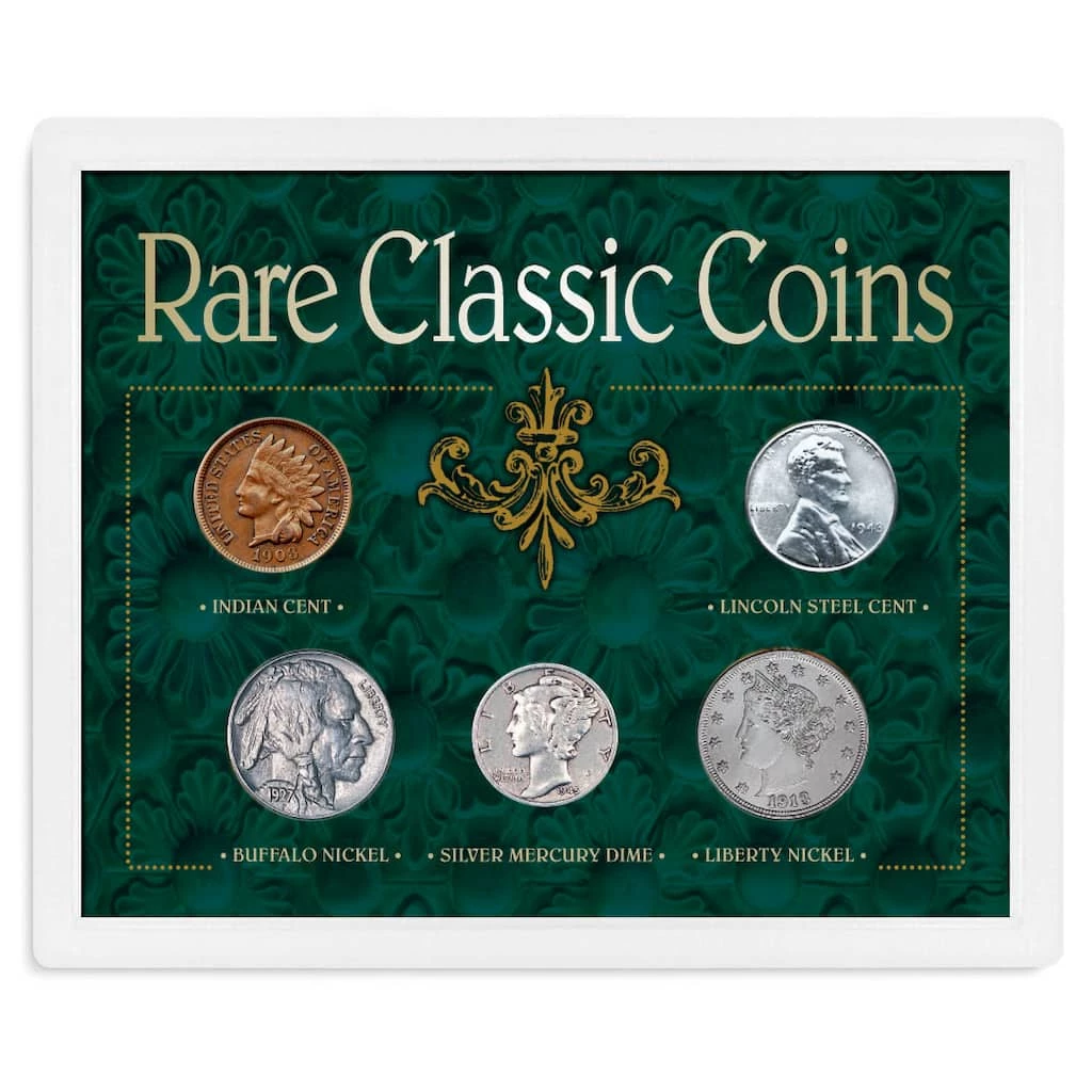 American history shines in our rare and classic US coin collection. Both the Indian Head Penny (1859-1909) and the Buffalo nickel (1913-1938) commemorate our country’s westward expansion with Native American obverse. The Liberty Head Nickel (1883-1912) honored our original Colonies with 13 raised stars. The silver Mercury dime (1916-1945) symbolized the freedom of thought cherished by our great nation. And the Lincoln steel penny was minted only in 1943 to conserve copper for World War II needs.
