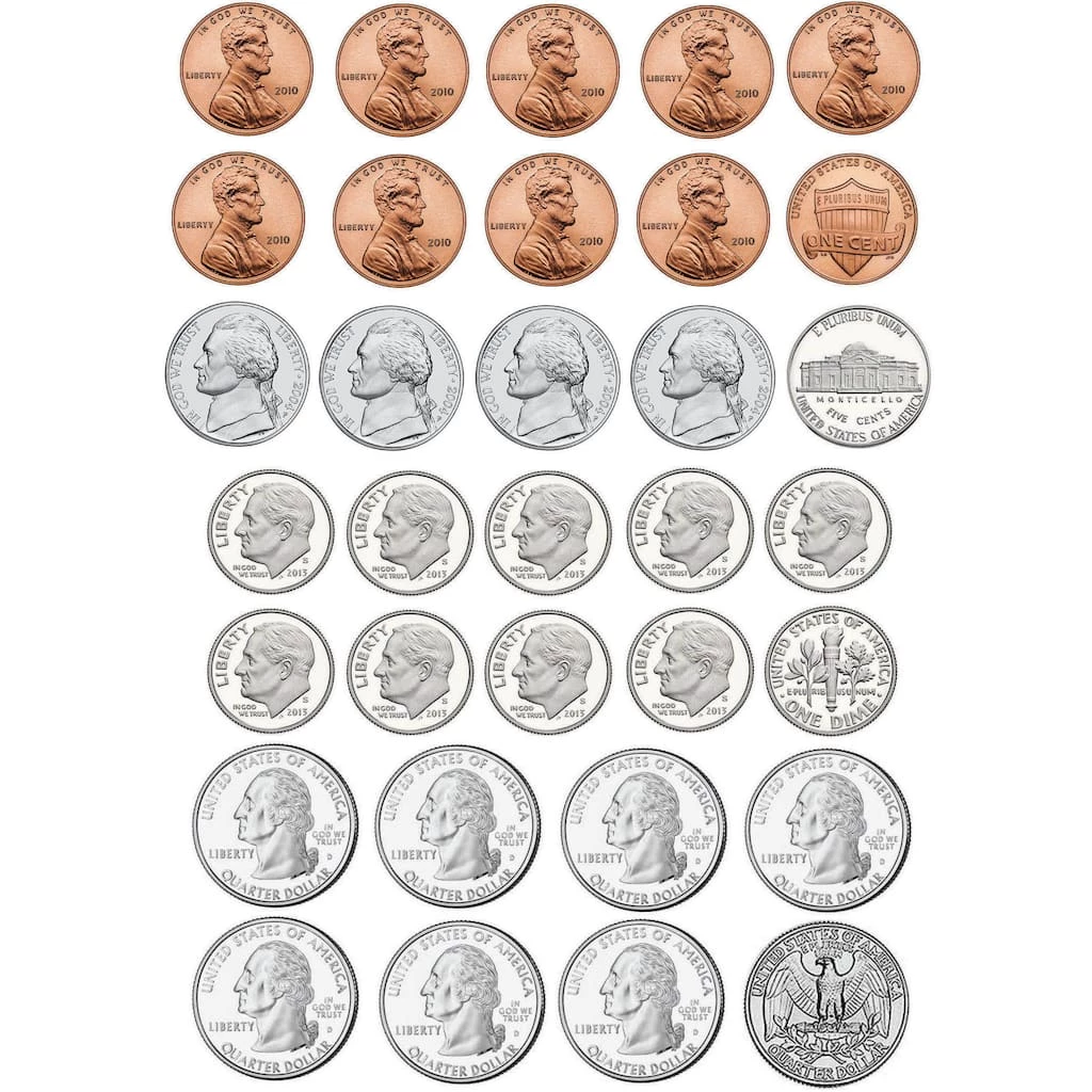 These Die-cut magnetic US currency pieces feature a real-look, great for basic money counting, sorting, grouping, and making change. The pieces punch out from an 8.5″ x 11″ magnetic sheet and are great for use on magnetic whiteboards, and sticks to any magnetic surface. Each pack of Die-Cut Magnetic US Coins contains 33 pieces that include pennies, nickels, dimes, and quarters.