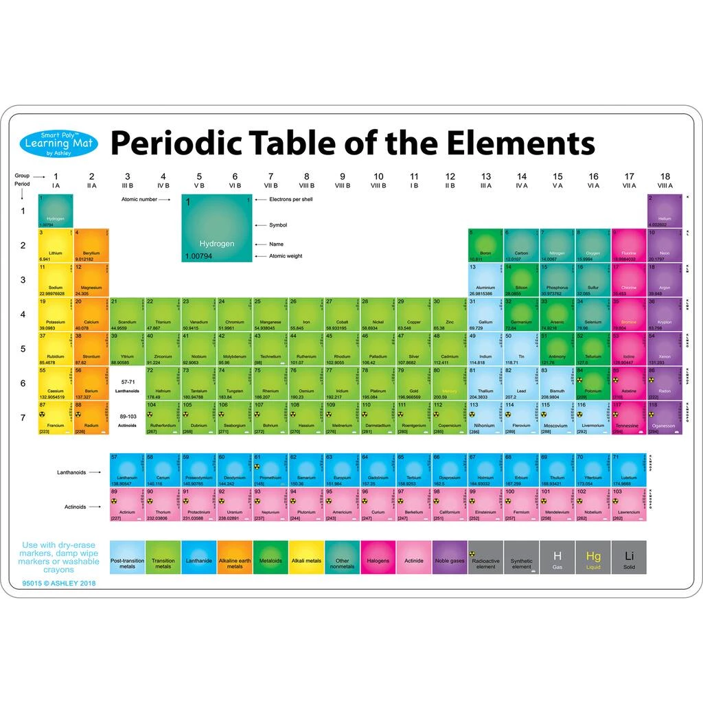 The learning mat features the Periodic Table of the Elements labeled on the front and blank on the back. Up to date with elements. Heavy duty double-sided surface for fun and colorful learning on both sides. Write-on/wipe-off surface. Use with dry erase or water based markers and washable crayons. Each side is an interactive lesson.Β