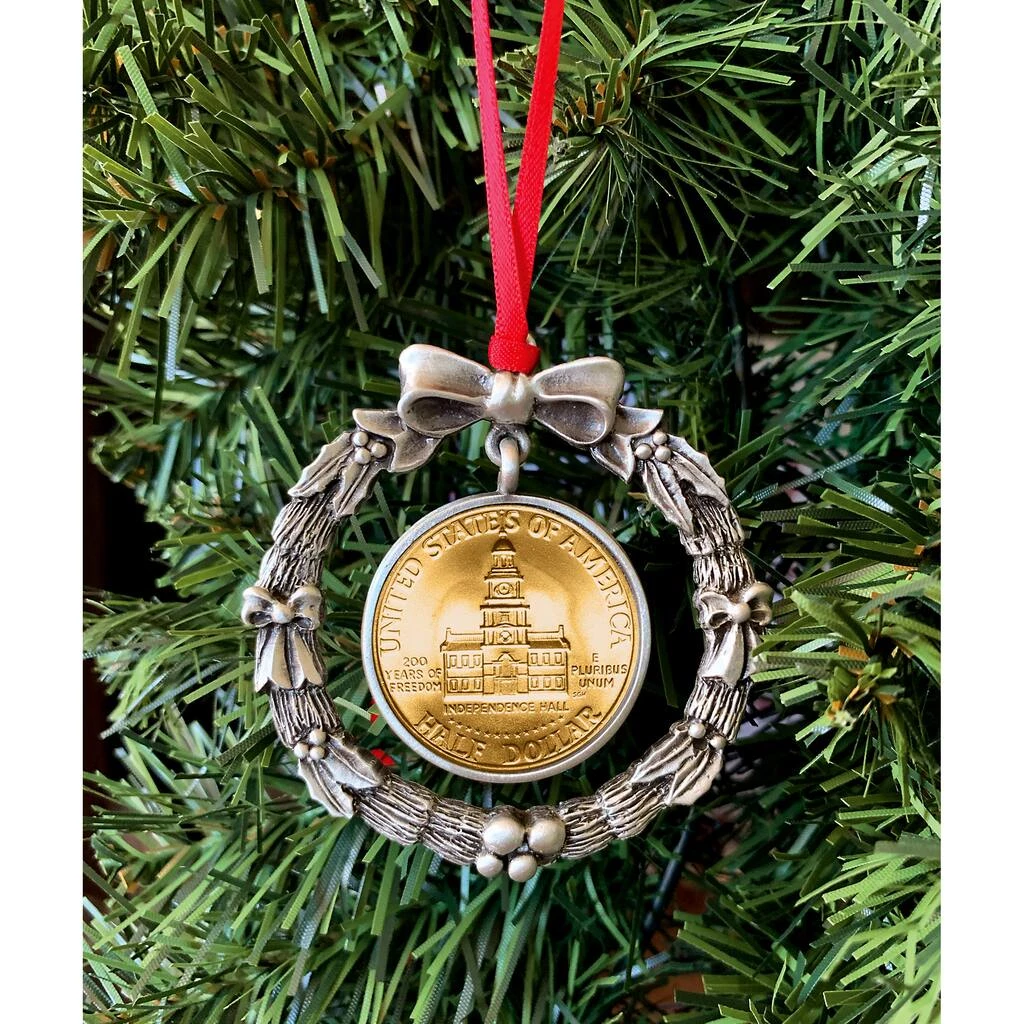 The perfect gift for someone who loves Christmas, this genuine United States Half Dollar is plated in 24 karat gold for a festive look. The JFK Half Dollar was first minted in 1964. The half dollar mint years will range from 1971 to present. The bezelled half dollar hangs in the center of a fine pewter wreath ornament. The ornament comes with a red ribbon in a blue jewelry pouch and includes a Certificate of Authenticity. All years and mint marks will vary.