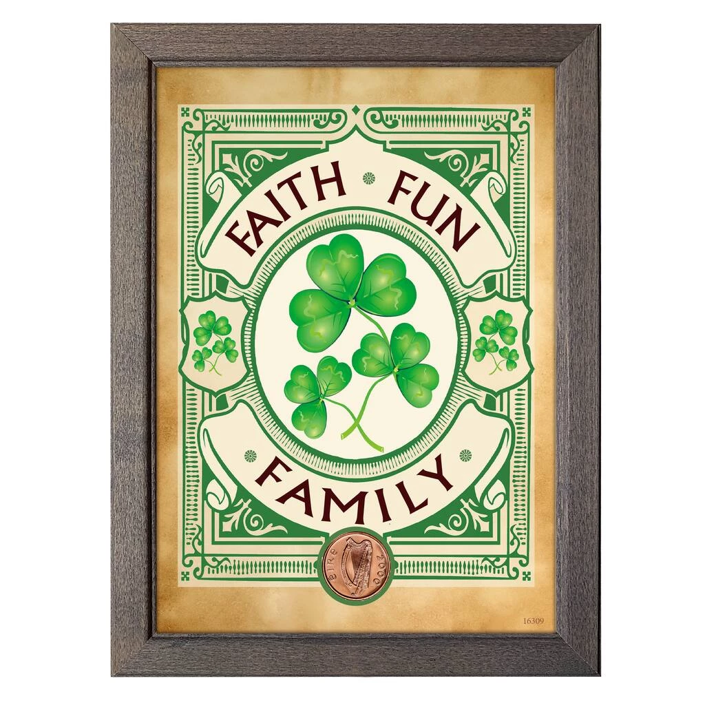 Remind yourself daily of the three things everyone should have in their life, with the Irish Coin Faith, Fun, Family Coin table top decor framed art. An Irish Penny minted from 1971 to 2000 surrounded by shamrocks is the center piece of this frame. The artwork is housed in a gray wood frame with easel measuring 7 long by 5 wide inches. A Certificate of Authenticity is included. Mint marks will vary. Irish Penny years will vary from 1971 through 2000.