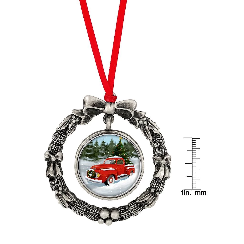 The perfect gift for someone who love vintage trucks and Christmas. A genuine United States Half Dollar is colorized using a special ink process with a fun image of a holiday red truck. The JFK Half Dollar was first minted in 1964. The half dollar mint years will range from 1971 to present. The bezelled vintage truck half dollar hangs in the center of a fine pewter wreath ornament. The wreath ornament measures 2.75 inches tall. The ornament comes with a red ribbon in a blue jewelry pouch and includes a Certificate of Authenticity. All years and mint marks will vary.