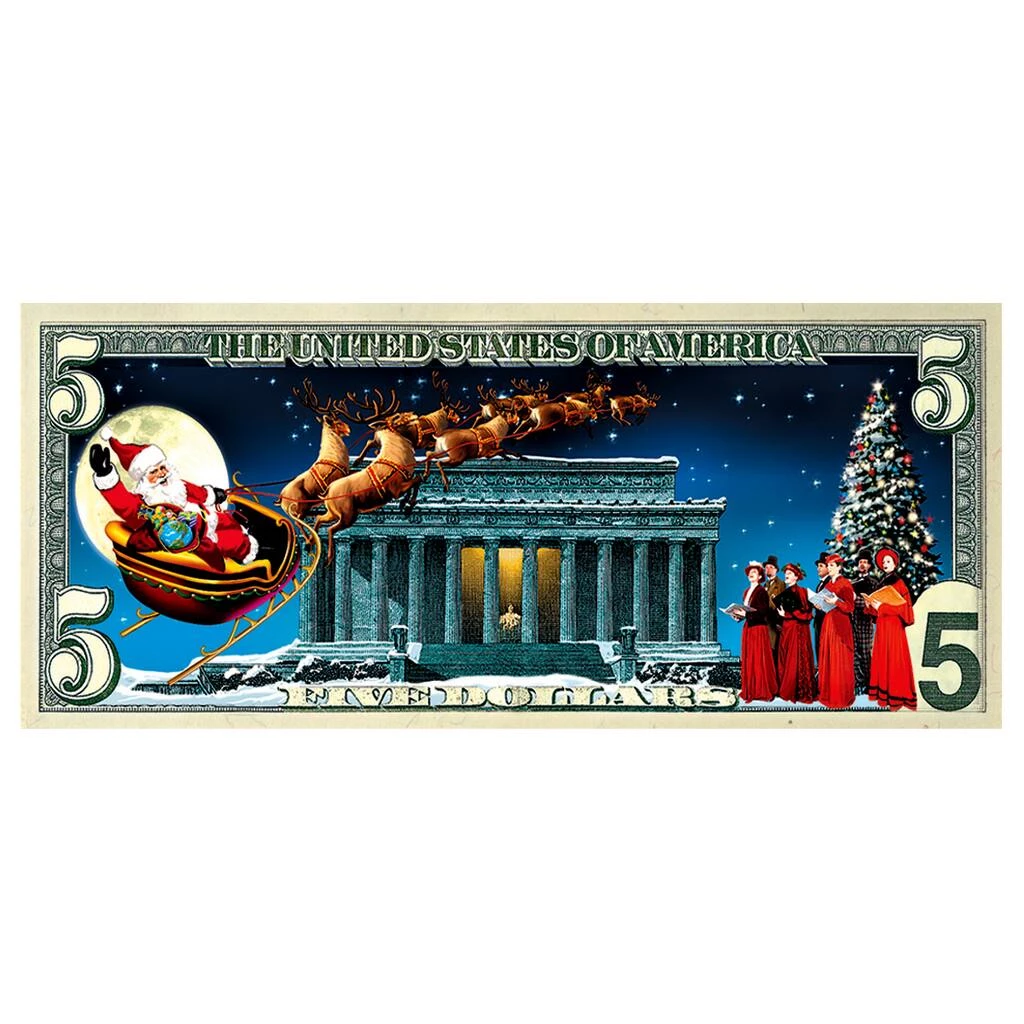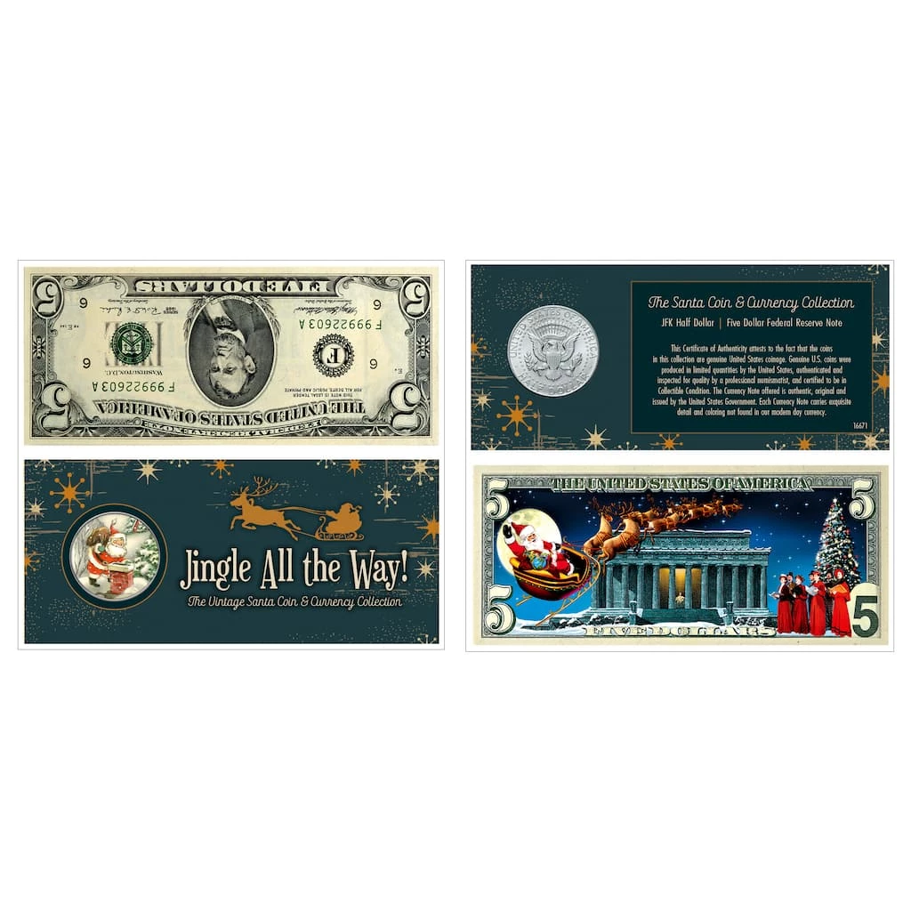 “And to all a good night!” Inspired by the spirit of Christmas, our artists have enhanced the reverse of the $5 Bill with this delightful, whimsical design. Seated in his sleigh, Santa waves merrily as he soars over the Lincoln Memorial into the starry Christmas night. Finely detailed in rich Full Color, the $5 Holiday Bill is also featured with a JFK Half Dollar minted from 1971 to present colorized with a Vintage Santa. The coin and currency collection includes a Certificate of Authenticity and is presented in a protective vinyl holder. A unique and charming gift that will be enjoyed for years to come.
