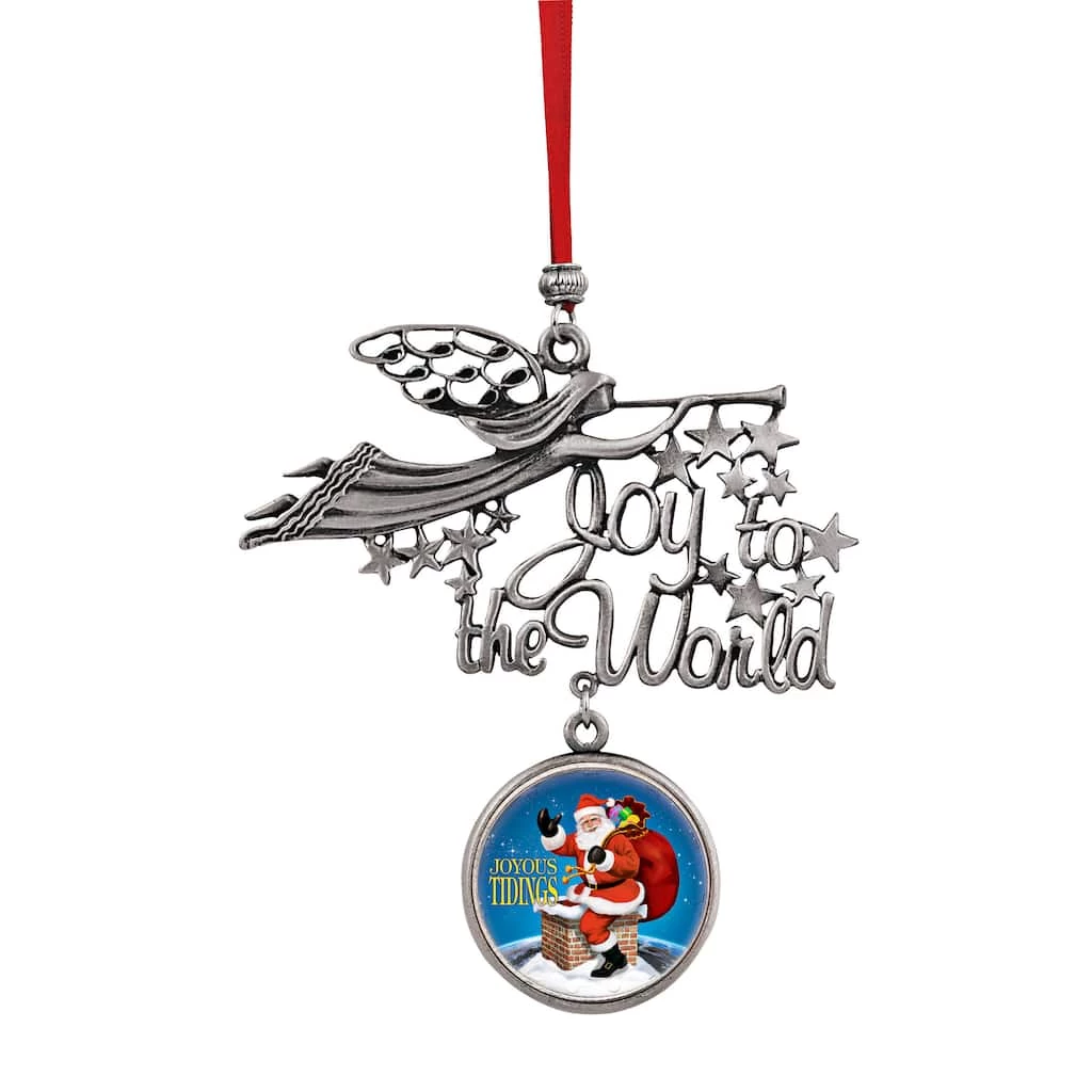 Decorate your tree with a piece of history. The Joy to the World Santa JFK Half Dollar Coin Christmas ornament will add color, beauty and history to your tree. A genuine JFK Half Dollar colorized with an image of Santa using a special ink process is set in a pewter bezel and hangs from an angel heralding Joy to the World Christmas ornament. The JFK Half Dollar minted from 1964 to present was designed by Gilroy Roberts and Frank Gasparro and features the profile of President John F. Kennedy on the obverse and the Presidential Seal on the reverse. The Santa design titled Joyous Tidings features Santa getting ready to slide down a chimney. The pewter ornament features an angel, stars and the words Joy to the World. The ornament comes in a blue pouch and includes a Certificate of Authenticity.