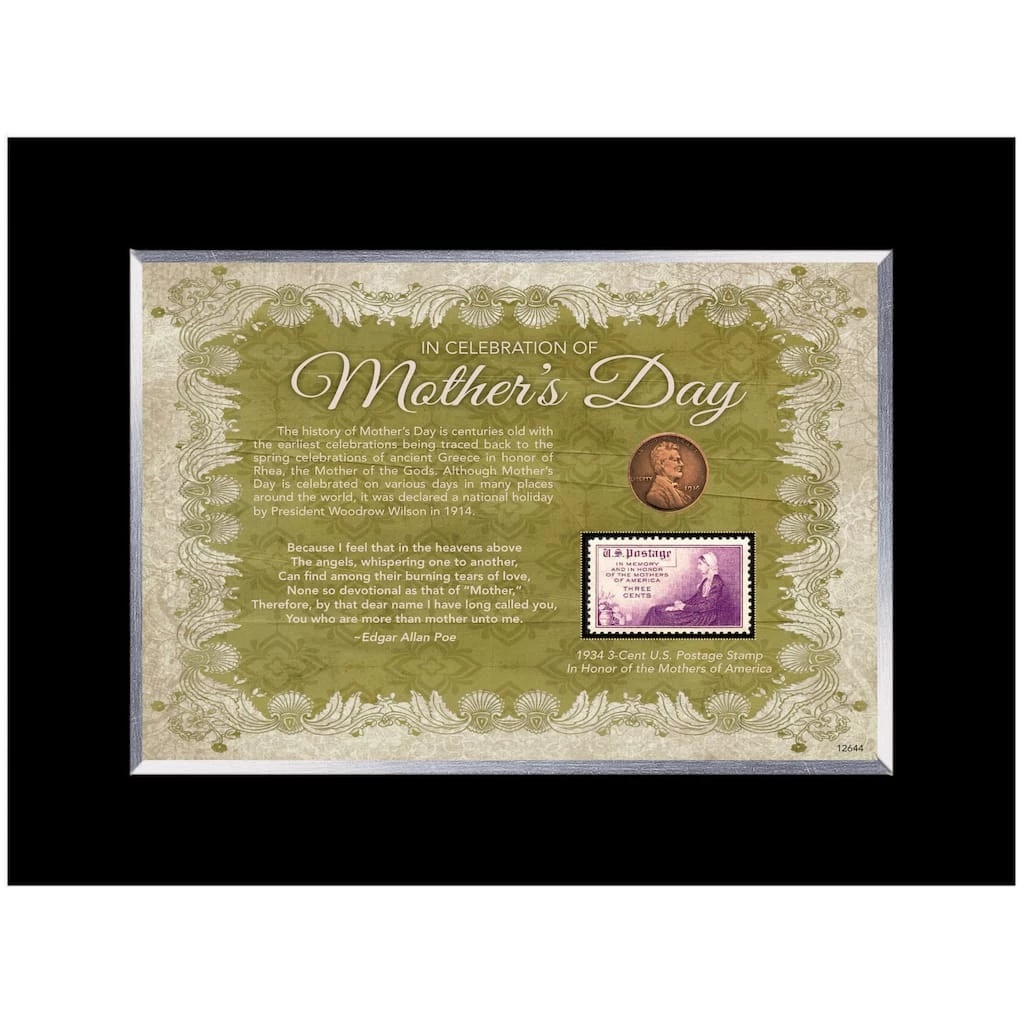 President Woodrow Wilson declared May 9 as the official national holiday to celebrate Mother’s Day. Show your mom how much you love her and give this memento from history. The black desk frame contains a genuine 1914 Lincoln Wheat Penny and a mint Mother’s Day stamp issued by the US Post Office created in 1934. The frame has an easel back and also features a beautiful poem by Edgar Allen Poe. The Lincoln Wheat Penny is composed of copper and was minted from 1909-1958. The Mother’s Day Stamp was modeled after Whistler’s mother and is in honor of the mothers of America.