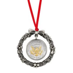 The perfect gift for someone who loves Christmas. A genuine United States Half Dollar is selectively layered in gold on the reverse Presidential Seal for a festive look. The JFK Half Dollar was first minted in 1964. The half dollar mint years will range from 1971 to present. The bezelled half dollar hangs in the center of a fine pewter wreath ornament. The ornament comes with a red ribbon in a blue jewelry pouch and includes a Certificate of Authenticity. All years and mint marks will vary.