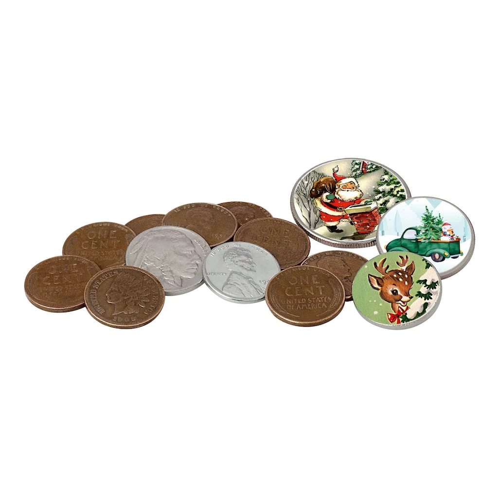 Imagine the delight when Santa’s Coin Collection Sack is opened on Christmas morning. Colorized holiday images are featured on genuine JFK Half Dollar, Washington Quarter and a Jefferson Nickel. The three piece colorized set displays holiday themed images expertly inked in different scenes on United States coins along with an Indian Head Cent guaranteed to be over 100 years old, a Lincoln Steel Penny minted only in 1943, eight Lincoln Wheat Cents minted from 1909 to 1958 and a Buffalo Nickel minted from 1913 to 1938 in a fun canvas bag printed with an image of Santa Claus. A Certificate of Authenticity is included. The mint mark and year will vary.