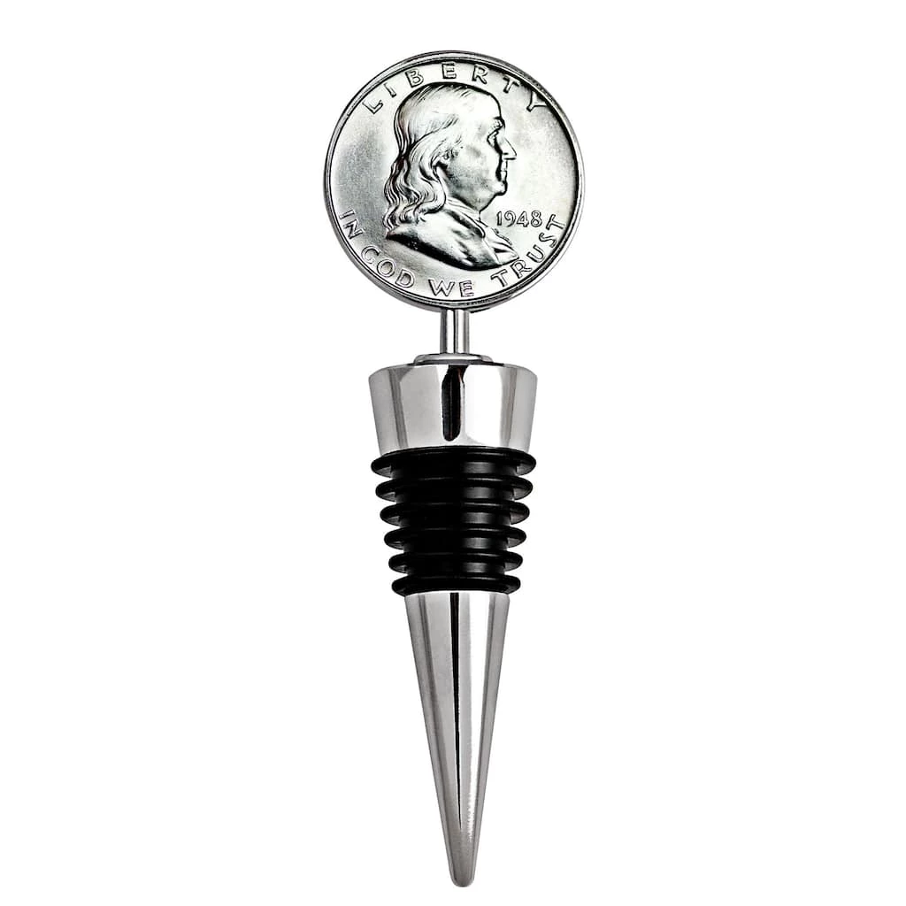 Give the perfect gift for the wine lover, the Silver Franklin Half Dollar Wine Stopper. The silver tone wine stopper features a genuine Silver Franklin Half Dollar minted from 1948 to 1963, mint year and mint mark will vary. The United States Silver Franklin Half Dollar is composed of .900 and designed by John R. Sinnock. The wine stopper is composed of a base metal alloy and rubber. The top unscrews for cleaning purposes. The wine stopper measures approximately 4 inches in height by 1.3 inches in width and weighs 2 ounces. A Certificate of Authenticity is included.