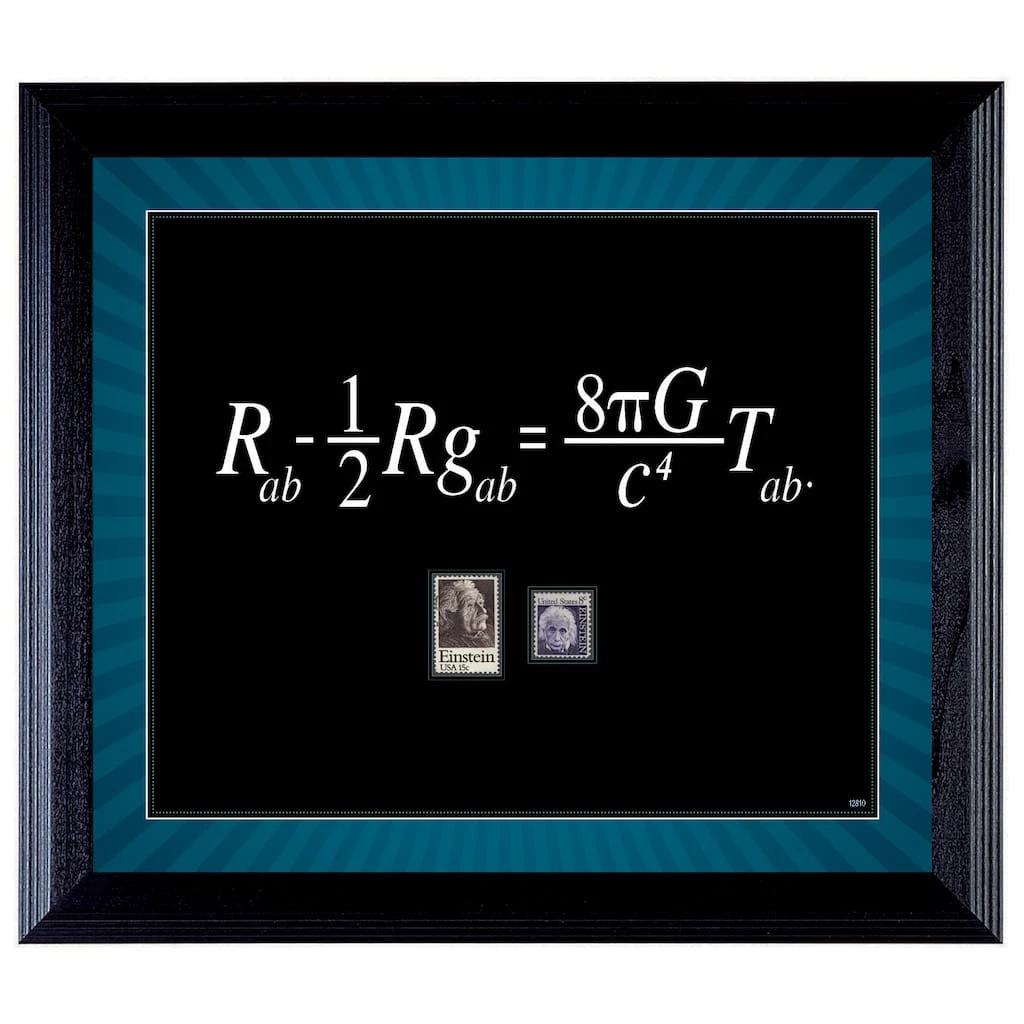 Think like a geek. The Theory Wall Frame is a great addition to any office, dorm room or den wall. The Theory of Relativity features two US mint postage stamps of Albert Einstein. The mint stamps were issued in 1979 and 1966. The 15 cent stamp marks the 100 year anniversary of Einstein’s birth. The 8 cent stamp was part of a series of prominent Americans.