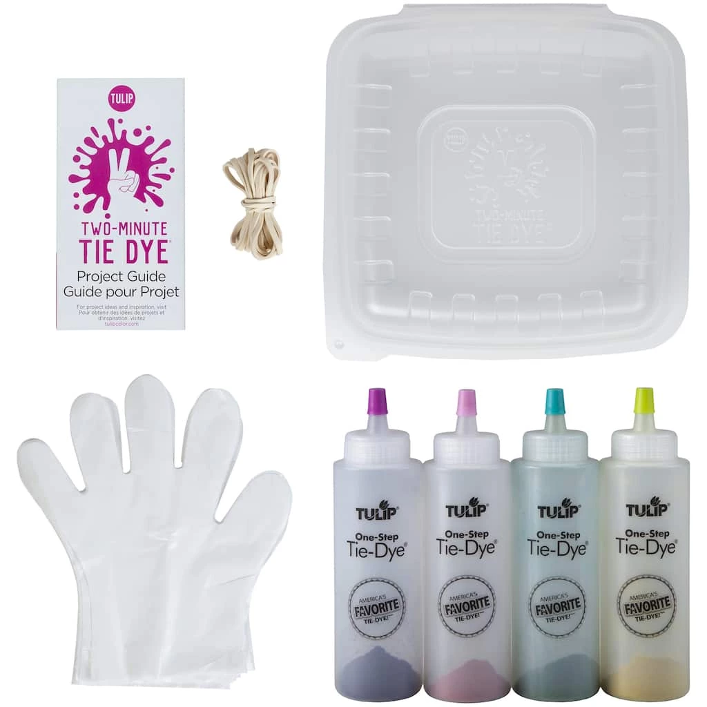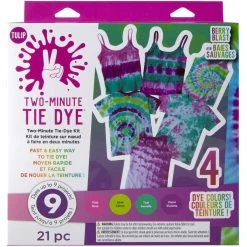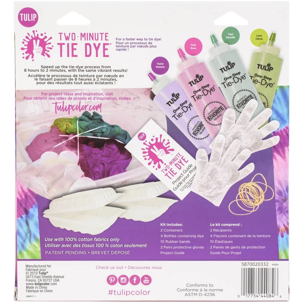 Speed up the dye set process from 8 hours to 2 minutes with the same vibrant results! This patent-pending Two-Minute Tie-Dye Kit features specially made containers and supplies to make tie-dye magic in just minutes. For use with 100% cotton fabrics only. Fabrics MUST be thoroughly damp before microwaving in containers. WARNING: Fabric may be hot after microwaving. Use extreme caution! Allow fabric to cool.