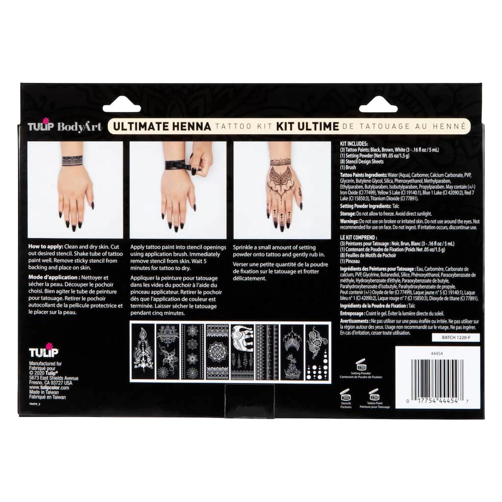 Turn yourself into a work of art with Tulip Body Art. Easily create beautiful, intricate henna-inspired designs with the high-definition stencils included in this ultimate henna tattoo kit. Perfect for events or simply celebrating your personal style, self expression is fun and easy with Tulip Body Art. Kit includes black, white and brown tattoo paints with precision tips for free-hand application if desired, setting powder, an application brush and 8 high-definition sticky stencil sheets. Tattoos are long lasting with proper care.