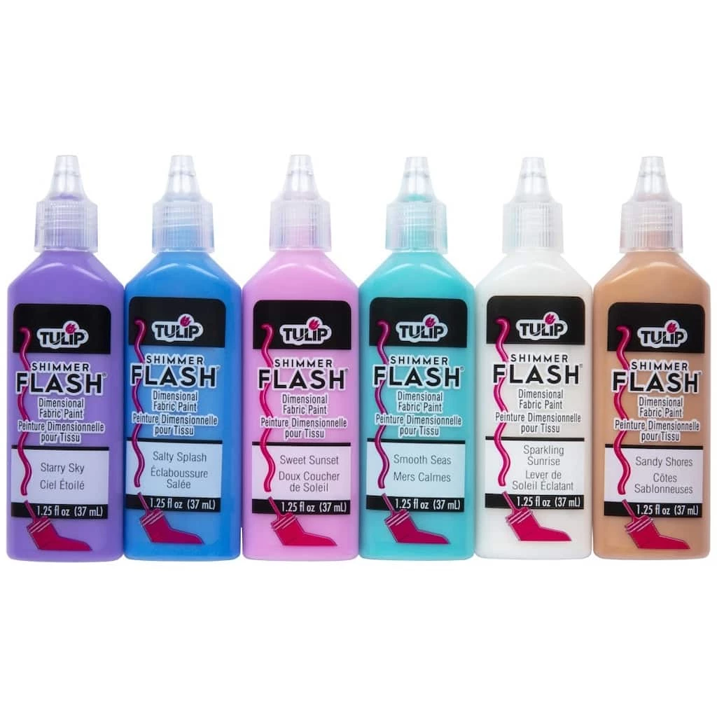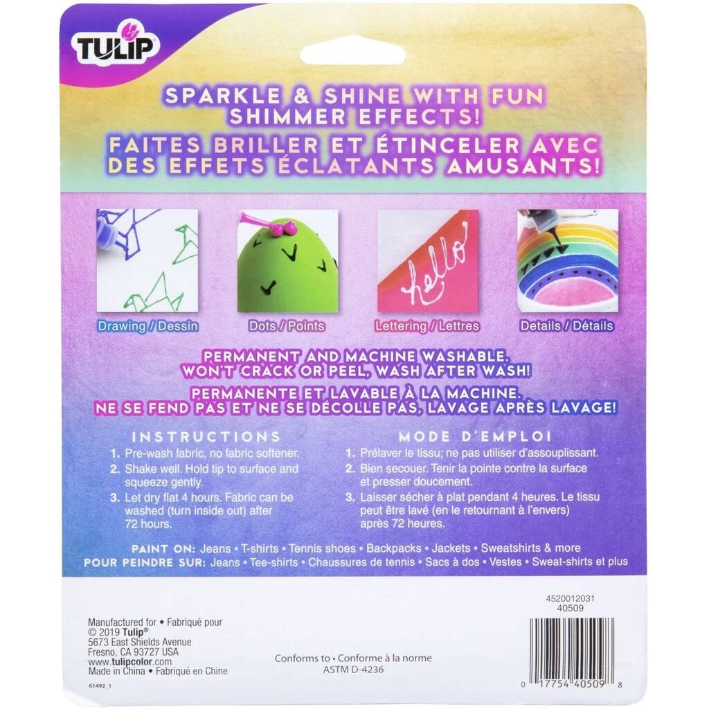 Give your creativity a flash of brilliance with Tulip Shimmer Flash Dimensional Paint. This nontoxic, multicolored paint is infused with beautiful metallic shimmer that causes each color to appear to shift with movement. Paints dry permanent, flexible and machine washable. Each paint bottle comes with precision tips for easy application.