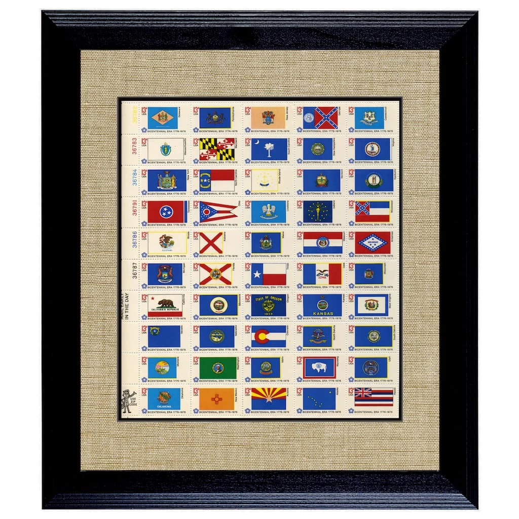 This collectible includes the complete sheet of the 1976 US Flag Stamp Collection in a solid wood 16″ x 14″ frame. Stamps are in mint state.