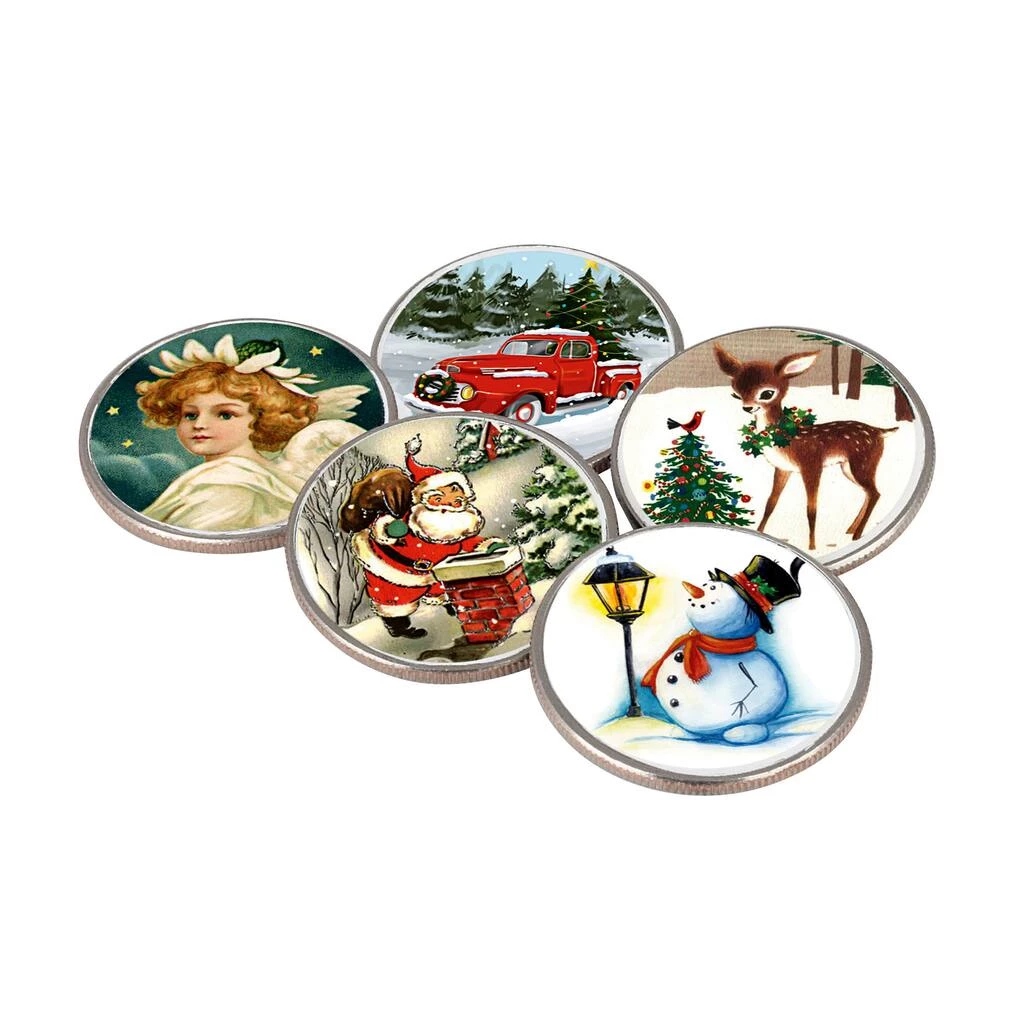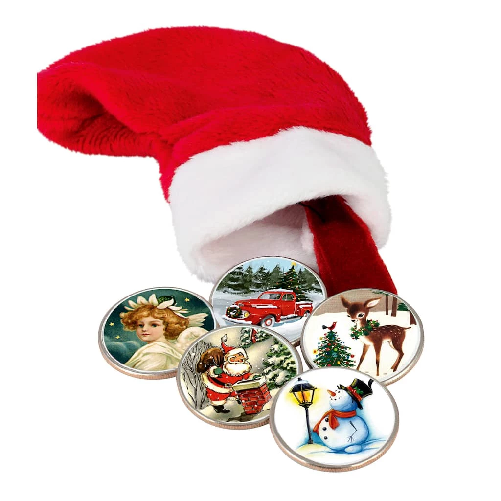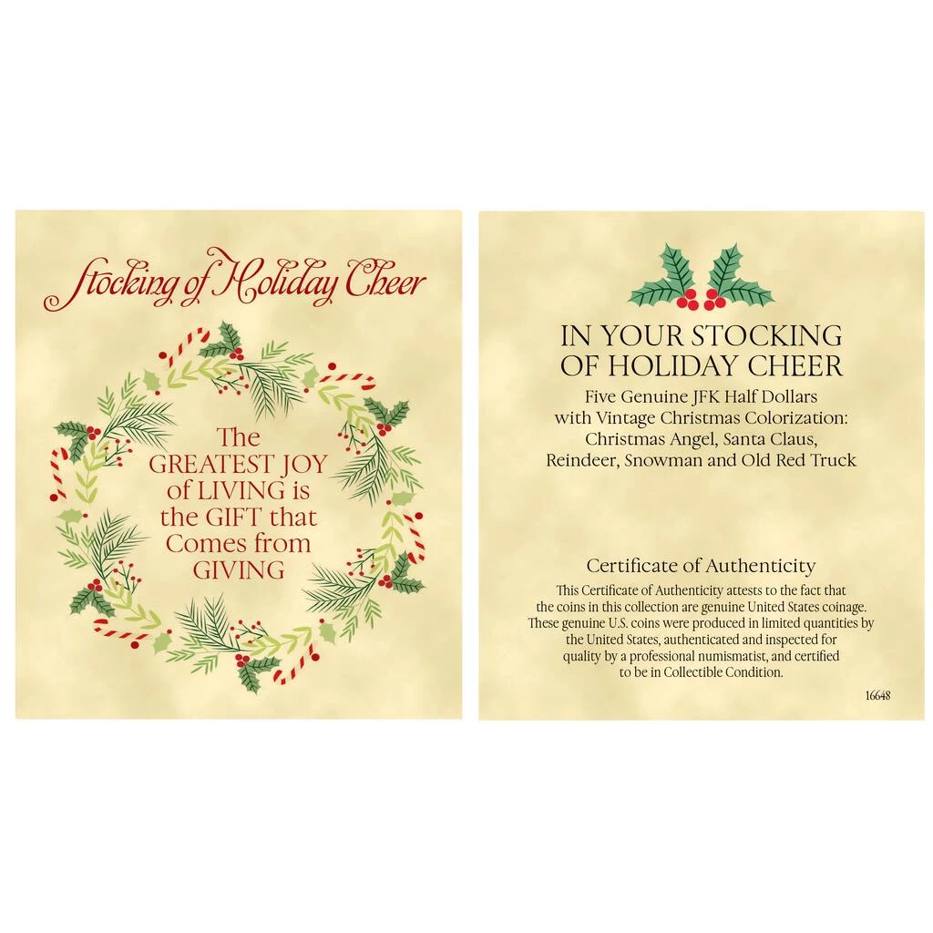 Imagine the delight when the Vintage Holiday Coin Collection Stocking is opened on Christmas morning. Images of Santa Claus, a reindeer, an angel, a snowman and a red truck carrying a Christmas tree are featured on genuine JFK Half Dollars minted from 1971 to present. The five piece set displays holiday themed images expertly inked in different scenes on United States coins in a red Christmas stocking. Each JFK Half Dollar shows a different vintage design setting. The coins are colorized using a special ink process. A Certificate of Authenticity is included. The mint mark and year will vary.