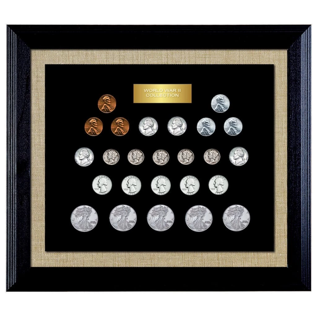 Recapture the drama of America’s fight for freedom with authentic wartime coins from World War II. The collection contains 25 U.S. Mint coins struck during the war years. Included are .900 Fine Silver coins, five Mercury Dimes, five Washington Quarters and five Walking Liberty Half Dollars. The set also contains three 1943 Steel Pennies, three Shellcase Pennies minted 1944-1946 and four Silver Wartime Jefferson Nickels minted 1942-1945.