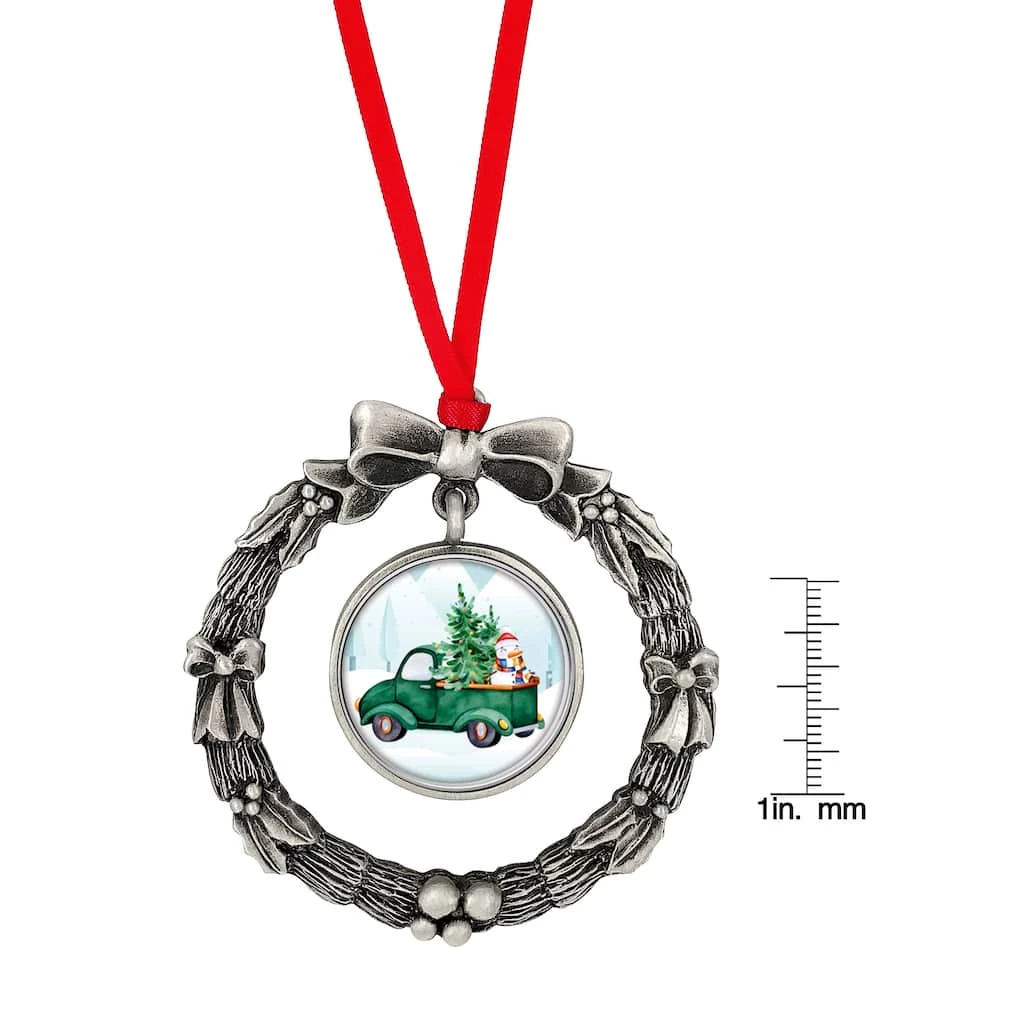 The perfect gift for someone who loves vintage trucks and Christmas. A genuine United States Quarter is colorized using a special ink process with a fun image of a holiday green truck. The Washington Quarter was first minted in 1932. The quarter mint years will range from 1965 to present. The bezelled Christmas green truck quarter hangs in the center of a fine pewter wreath ornament. The wreath ornament measures 2.75 inches tall. The ornament comes with a red ribbon in a blue jewelry pouch and includes a Certificate of Authenticity. All years and mint marks will vary.
