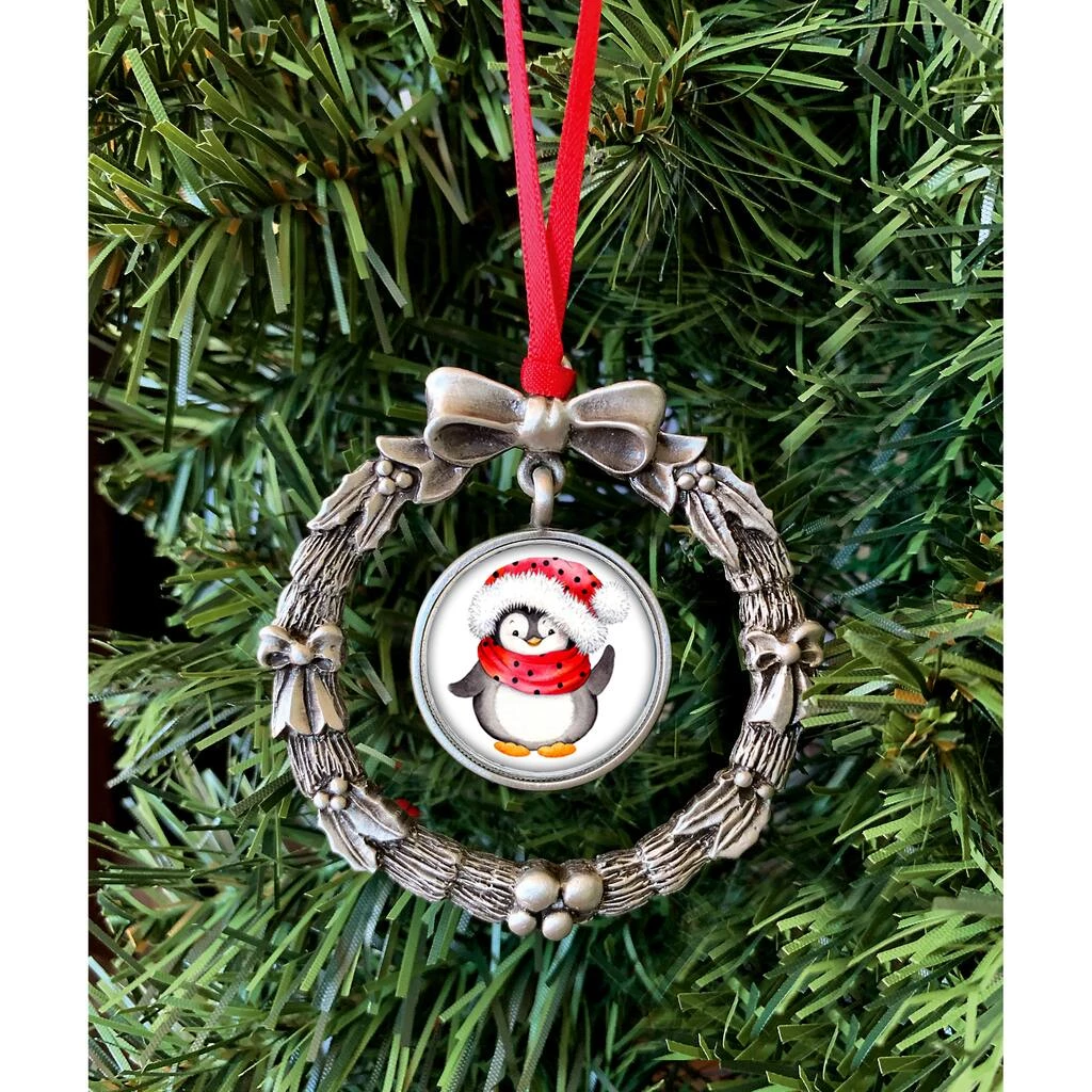 The perfect gift for someone who loves penguins and Christmas. A genuine United States Quarter is colorized using a special ink process with a fun image of a holiday penguin. The Washington Quarter was first minted in 1932. The quarter mint years will range from 1965 to present. The bezelled penguin quarter hangs in the center of a fine pewter wreath ornament. The wreath ornament measures 2.75 inches tall. The ornament comes with a red ribbon in a blue jewelry pouch and includes a Certificate of Authenticity. All years and mint marks will vary.